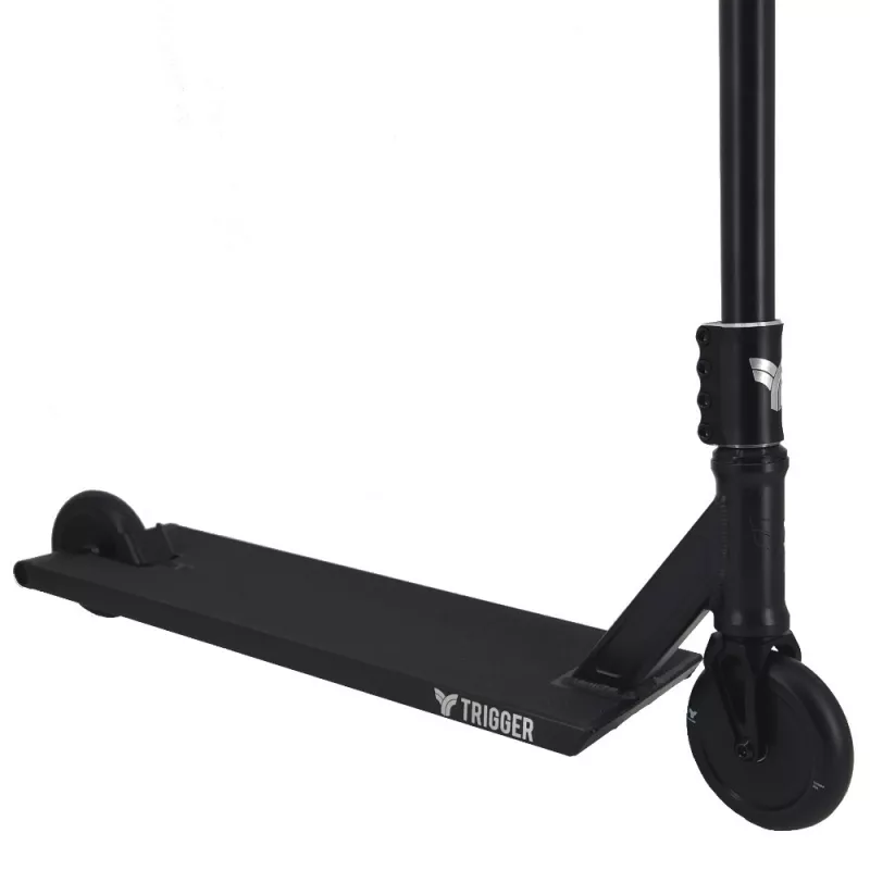 Trottinette freestyle TRIGGER Nemestia V3 77 Noir conçue pour envoyer fort en street comme en skatepark tout en gardant du contrôle. Évolution directe de la V2, cette V3 optimise la solidité, simplifie l’entretien et réduit le poids pour un ride précis sur curbs, rails et quarters.
